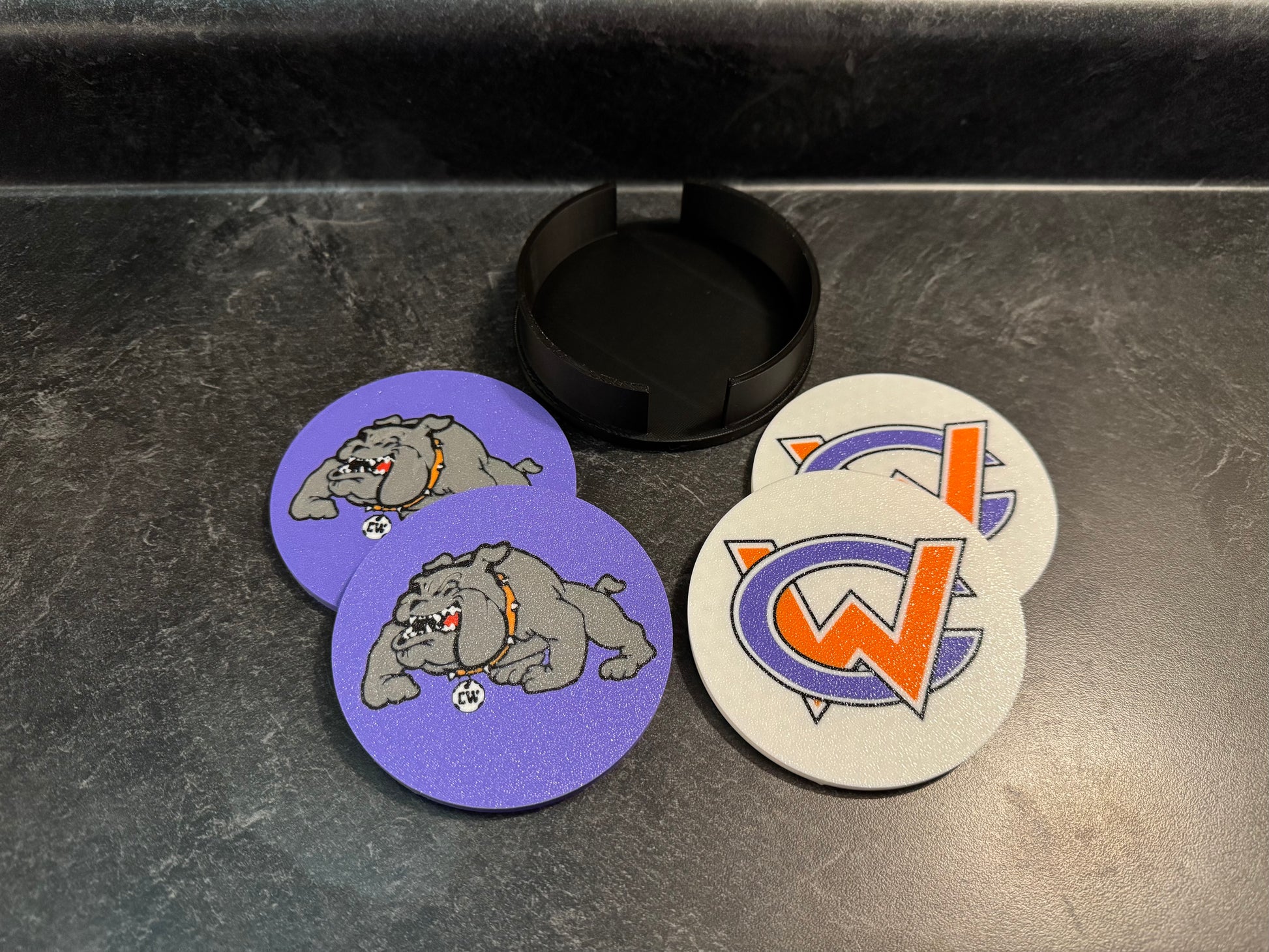 Four Chetek Weyerhaeuser Coasters with holder. Approximately 3 3/4 inches in diameter.