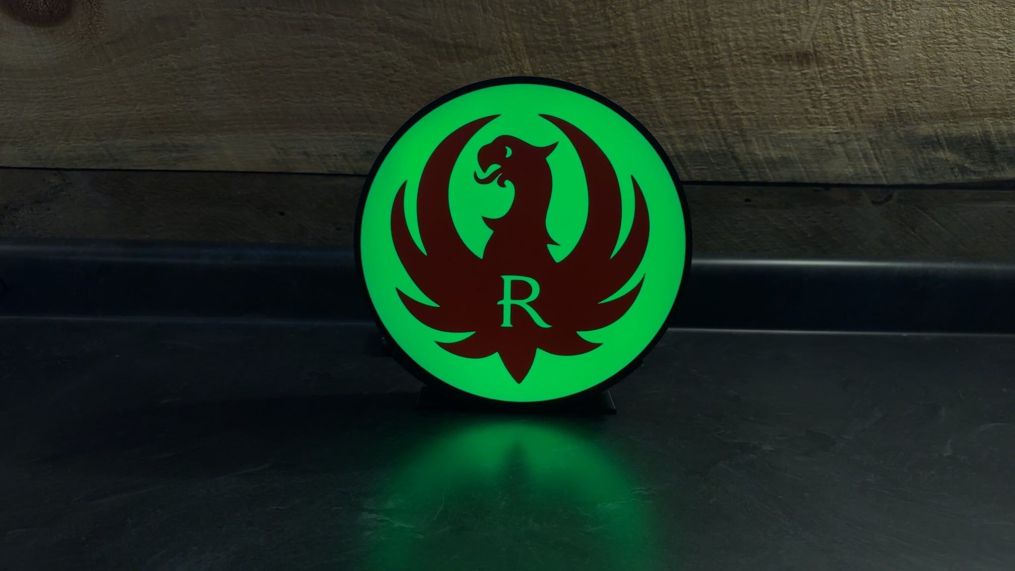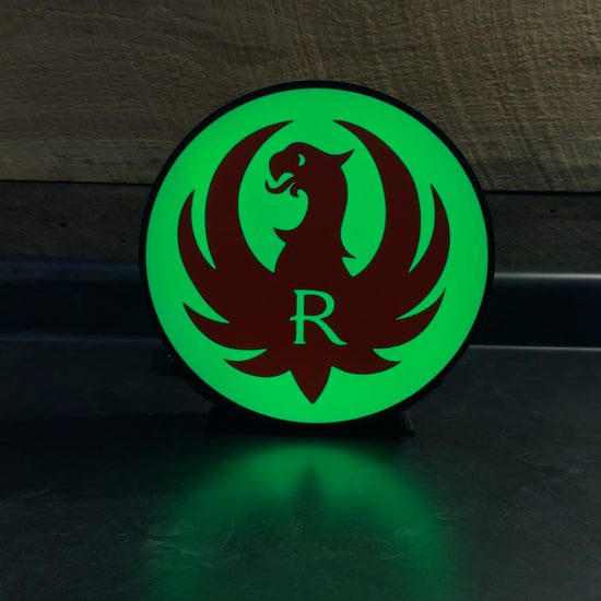 Ruger LED Light up sign. Approximately 10 inches in diameter. Comes with IR remote. It can hang on the wall or sit on a table. We also make custom signs.